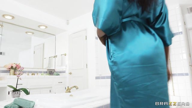 Osa Lovely is looking hot. Her all-natural titties and perfect round ass are ripe for the taking. When getting ready for a bath, she realizes she forgot one thing, her phone. She robes up and heads to the living room to find it. Her new stepson has his horned-up buddy over, Juan Loco, and he's quick to notice the smoke show of a stepmom, Osa, right away. Hard not to when her titty is popping right out of her robe! After getting some upskirt action, Juan decides to hit the head in hopes of seeing more of what’s under Osa's robe. Juan discovers her bubble bath and takes the leap to hide his hard cock in the warm water. Osa returns and gets soapy in the suds only to discover Juan's dick bobbing at the surface! It's a good thing she likes his cock. College guys, they're all the same. Lucky lil horndogs, am I right?