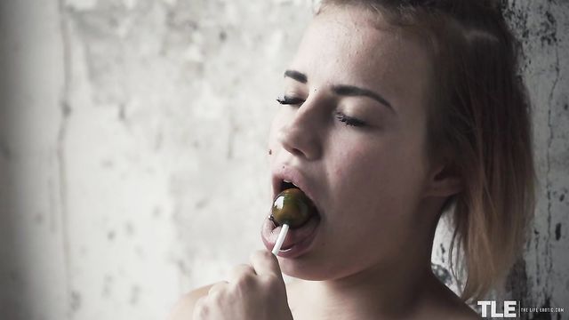 Hot Angelina A – a sassy tattooed babe from Belarus, with a blonde-tipped brunette bob and a beauty mark on one cheek – is taking a barefoot walk outdoors. Dressed in just a revealing pink babydoll top and high-cut white lace panties, she’s carrying a duffel bag and sucking on a couple lollipops. She wanders through the long grass and weeds near some derelict buildings, then takes a break in the shelter of a large, arched concrete tunnel. Sitting splay-legged on her bag on the dirt floor, she enjoys her sweet treat and begins to rub her pussy through her underwear. She soon pulls the crotch aside to reveal a shaved pussy and starts to masturbate with manicured fingers, still sucking on a lollipop. She peels off her panties and continues to pleasure herself, a look of ecstasy on her face as she swirls her pierced tongue around the sweet, hard candy and spins it against her full lips. Moaning rhythmically, she rubs her clit and slides two fingers inside. Next, she runs one of the drool-wet lollipops down the front of her body and circles it over her fleshy pink slit, before slipping it in her snatch. She pumps and grinds the jewel-green candy inside of her, while sucking on the other. She raises her ass clear of the ground, rocking and squatting on her tiptoes, smearing her entire slit with pussy juices as the camera homes in for a close-up. She reaches behind each thigh to vary the angle, then brings the second lollipop down to tease her clit as she screws her snatch with the first. Her cries become louder and more urgent until, at last, she cums, letting one lollipop fall into the dirt as she relaxes and caresses her curves…