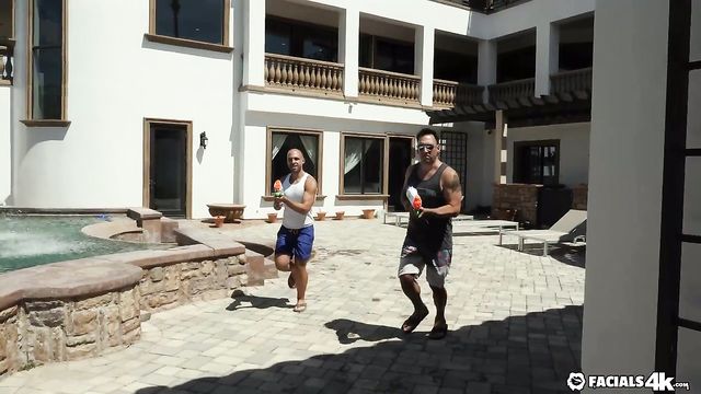 Charma has a water gun fight by the pool and gets fucked and facialed by 2 guys.