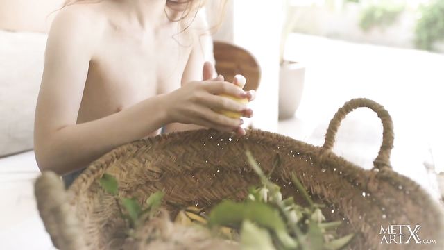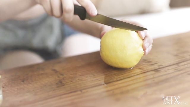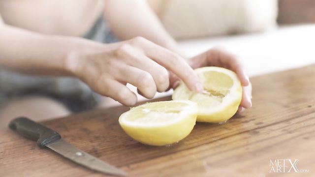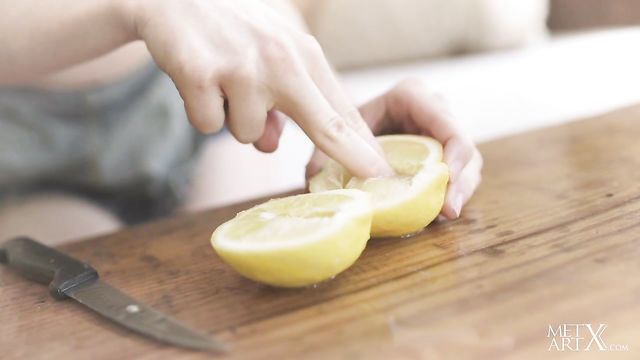 Stunning redhead Jia Lissa picks lemons in the orchard. She squeezes one, letting the juice trickle down her wrist and licking it up. The freckled beauty’s face is alight with sensual pleasure as she pulls her overalls down to bare her sexy small breasts, teasing her nipples stiff. She sucks the juice from her fingers and squeezes more over her white panties, which turn transparent as they get soaked. Tugging her panties aside to reveal her unshaven pussy with its natural red bush, she turns onto her knees and slides them down over her curvy ass. As she rubs her hot pink slit, she spreads her ass cheeks and circles a finger around her tight pucker, then plunges it inside. Now she rubs her clit in firm circles, thrusting her fingers in until she’s penetrating herself deeply in both holes. She lies back to frig herself to a long, intense orgasm.