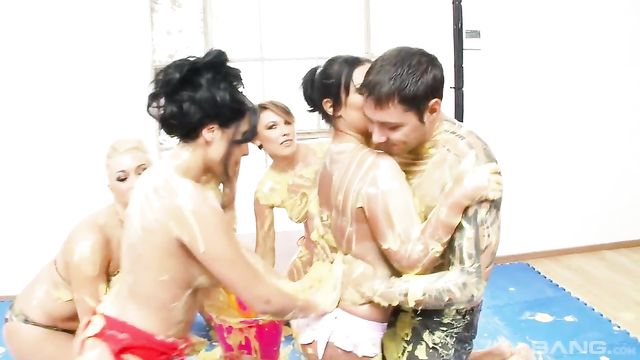 Jasmine Black, Sammy Jayne, Jess, Chelsea Sax and Romana Ryder are here to party! Watch these horny starlets wrestle and slide around on a tarp full of banana cream. Their asses and boobs glisten with the slippery sweet stuff and they are licking it off all their pussies and nipples as they wait for their turn to fuck the one porn stud in the room!