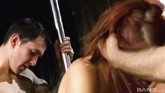 Roxy Foxxy is chained to a stripper pole in a BDSM dungeon as she awaits her fate. Soon she is joined by two studs with big cocks that take her from the front and back and fuck her face and pussy until they fill her mouth with cum.