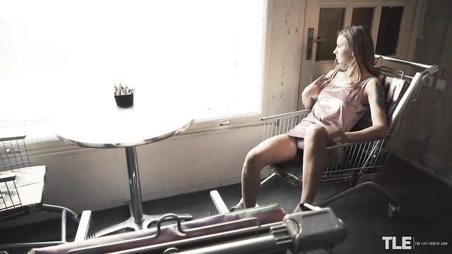 Sexy Lara A, a tattooed babe with cute braces and light brown hair, is sitting alone at a window table in a small, quirky cafe – the chairs are made from shopping carts. In a naughty mood, she splays her thighs so her minidress rides up to flash her black and pink thong – yet no one passing by outside seems to notice. Slowly and deliberately, she massages her breasts, popping one out briefly to tease her nipple. Then her hands wander to her crotch. Switching the focus to self-pleasure, she rolls the chair back to a more discreet spot and plays her fingers over her panty crotch, pulling it aside to finger her shaved pussy, stroking and circling her clit, then teasing herself through the fabric once again. She writhes in her seat, moaning loudly, then peels off her dress and stands up to remove her panties, before kneeling on the chair, naked and barefoot, to reach back and plow herself doggy style. The camera zooms in for a close-up of her firm, tight ass as she sinks one finger, then two, inside of her snatch to the knuckle – and all the while, people pass by outside, oblivious to the horny scene playing out just feet away. Next, she perches on the back of the cart, with her pointed toes resting on the arms. Flaunting her taut belly and with her thighs splayed wide, she continues to frig herself. As one hand caresses her perky breasts and caramel-pink nipples, the other delves deep inside of her wet hole. After a while, she switches focus to her clit, scissoring two wet digits on either side of it, building up friction. She gets down off of the chair and twirls, showing off her perfect, slender curves, then bends over, standing doggy-style. Her fingers are drenched as she pounds them in and out, churning up her juices. Finally, she sits on the floor, not knowing or caring whether she can be seen as she fingerbangs herself into a frenzy, cute braces on display as she bites her lip in ecstasy. Her moans of pleasure turn to yelps and cries as she cums, then she writhes on the floor, playing with her tits as she enjoys the afterglow...