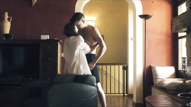 - Description: Affection meets raw lust in erotic movie "Tender Moment" by Andrej Lupin. Sexy Stefany Moon, a petite and pretty Russian brunette, wakes alone in a tangle of white sheets. Topless in pink panties, she exposes small, natural breasts as she stretches then gets out of bed to look for her man, Alberto Blanco. Playfully, she covers up with his white shirt then finds him lifting weights in the basement. She admires his dark good looks and ripped body, tempting him to abandon his workout. In the living room, they make out and Stefany takes off the shirt. Alberto carries her to the couch, with her legs wrapped around his waist, settling back with her on top. She takes control, dry-humping him through their underwear, then frees his huge cock, jacking it rock hard before removing his shorts. The tip is already oozing wet as she teases his head and shaft with her lips and tongue. Then she sucks him, with one manicured hand gliding up and down his rigid shaft. She strips off her panties and straddles him, playing his cock against her shaved pussy before guiding it inside. He holds her close and she gasps and yelps as she rides him hard. When Stefany sinks down to take his full length, Alberto takes charge, lifting her and laying her down on the couch, cock deep inside of her all the while. He plows her soaked pussy missionary style, thrusting slowly. Next, he lies beside her on the couch, with her ass against his crotch and legs splayed to open her up as he thrusts balls-deep in her snatch and caresses her tits. Their mutual adoration is obvious – this gorgeous couple can’t stop kissing – and it fuels their insatiable fucking. As Stefany’s orgasm starts to build she fingers her clit and Alberto strains to hold back, determined that she should cum first. Her body spasms, pussy clamping tight around his cock and, as he climaxes, he pulls out, splashing her belly, mound and tits with his load.