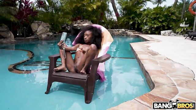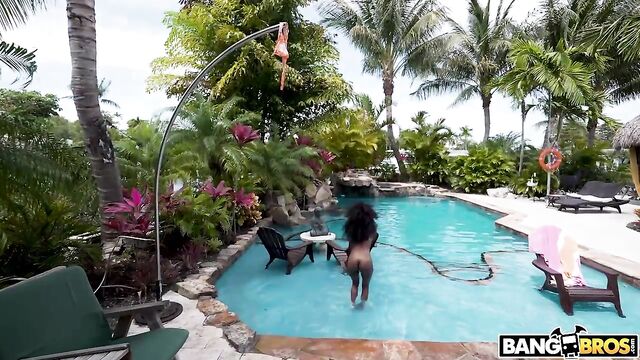 Mini Stallion needs some help getting her shirt down from the pole. Lucky for her, Jovan is here to help. He lifts her up and as a thank you, she sucks his dick. This girl may be small, but that throat game is far from tiny. She gives him an amazing blowjob before fucking him in multiple positions by the pool until he cums all over her face.