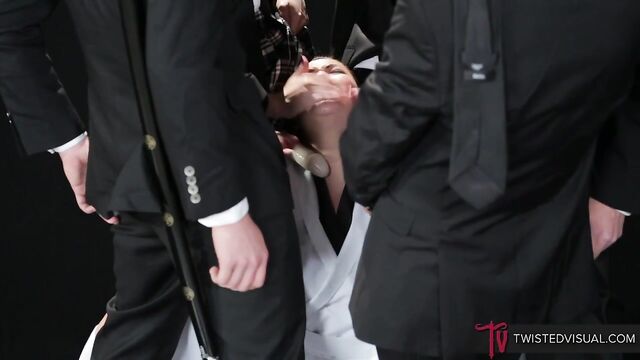 Pretty babe London Keyes, together with Dana DeArmond, Dana Vespoli, Chad Diamond, and Wolf Hudson, walk slowly toward the camera. The boys are wearing a tux while the girls are wearing what seems to be a school uniform. On the other hand, London is wearing a sacrificial robe. The gang comes to a halt. The others surround London. London gets on her knees to suck the boys’ cocks and the girls’ strap-on dildos. She is completely surrounded by real dicks and fake cocks. London tries to suck all of them one by one. Her mouth is constantly kept busy. The gang keeps their dicks close to her face. Her two hands and mouth are not enough to please all the cocks. She continues to ravage their big cocks, their dicks slide deeper into her mouth as she allows her throat and mouth muscles to relax. The sausage fest is just starting. The group laugh at her and spit on her face, but she loves the humiliation; London’s face is now covered in spit. They all take turns shoving their cock into her mouth. Her lips and tongue are constantly moving around. She tries to fit two cocks into her mouth. Dana dunks London’s face in ice-cold water. She strokes London’s neck while she is deepthroating a cock. The blowbang fest gets wetter and messier by the moment. Her face is starting look like a wet rag doll. The gang is not yet satisfied. They jam their cocks into her throat. London turns around as she sucks them in close succession. There is no moment of rest for this little whore. The crew keeps on taking turns inserting their hands, cocks, and dildos into her mouth. They throat-fucked London and dunk her in water until she is gasping for breath. Her labored-breathing echoes throughout the room. London can’t help but groan, moan and scream every time a cock pulls out of her mouth. She is totally overwhelmed by the cocks right on her face. After the wet and messy blowjob fest, the guys shower London with their warm cum. Her face is now full of spit, cold water, and warm cum. They made her into a complete cum basket. They clean her face with ice-cold water.