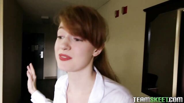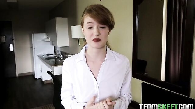 Bruno was all alone in his hotel room just trying to watch some porn and jerk off; thats when Abbey came in to drop some towels off, except she didnt even knock. Bruno was pissed that she came in without knocking and said hed call her manager but she begged him not to! He said there are ways to fix it and next thing we know shes on her knees slurping and jerking his gigantic dick! He bent Abbey over the bed and pulled down her pants and rammed it into her tight teen pussy from behind! Bruno flipped her over and pounded into her one last time before releasing his load all over her pussy! That should teach her knock before going into someones room...