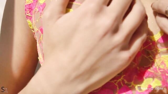 Fully aware of her mind-blowing beauty, StasyQ model ChloeQ throws a mesmerizing show for her beloved fans. Before Said Energizer grabs his camera, this dazzling brunette squeezes her gorgeous curves into neon lingerie that puts the emphasis on the stunner’s thigh tattoo. Finally ready to shoot Video Release 496, ChloeQ kneels on a white sofa and lifts her hands in the air, showing off her slim waist and divine breasts. While still on the bed, the brown-haired goddess flirts with the camera while feeling the touch of her black heels against her firm behind. Determined to spice things up even further, ChloeQ loses her bra and panties, sits on a pink footstool, and starts exploring her silky and tanned skin until her nipples stand up to full attention. Beyond naughty, ChloeQ looks through a window while exposing her bombastic booty to the camera. She pouts her lips and continues to seduce her devoted audience.