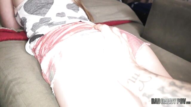 Step dad walks in on his step daughter, Alyce Anderson, talking to her phone. She is just laying there with her sexy teen body. Step dad now comes over to admire this beautiful step daughter of his by massaging her thighs. Alyce, now kind of turned on, quickly dismisses the call and faces step dad to focus her attention to him. Now that her distraction free, Alyce starts pulling out his dick out. Alyce starts working on that fat dick by licking and sucking the dick clean. While she does this, she slowly undress to reveal her teen slut features the step dad is after. He lies down and let her completely take over. Alyce had the proper etiquette on maintaining eye contact while doing so. What nice slut. Alyce stands up and sits back down on that dick like a chair. The taboo fucking starts now. Her nice pussy is now being displayed while a fat cock repeatedly pounds on it. She eventually flip over to give step dad some great view on her great ass. After some time, she pauses and sucks on his dick again and bending over for some more fucking. He fucks her from behind for a good few minutes and made her lie down eventually. Alyce spreads herself on the couch and let step daddy do the work. He comes closer and sticks his fat dick into her tight teen pussy. He continued fucking this teen slut until he peaks. With brief brakes in between with a blowjob, Alyce takes everything with no resistance or any sign of pain. She just enjoys this fucking like there’s nothing wrong with it. When step dad was few steps away from cumming, he pulls out. He jacks himself off until he covered Alyce tummy with some tender loving cum.