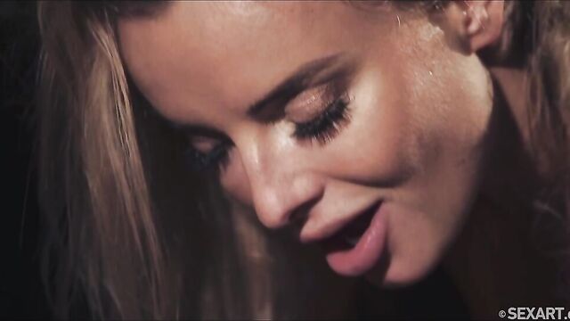 Sexy blonde Emma Button sits opposite Pavlos, devouring him with her eyes, as Andrej Lupin’s atmospheric "Shadows" begins. Illuminated by a spotlight in the dark room, seductive Emma raises her heel-clad foot for Pavlos to kiss, but pushes him back in his seat when he attempts to get closer. She takes off her sheer wrap, revealing her beautiful body in black lingerie; she leans in to kiss and caress her man, making it clear with every touch that she is in charge. He watches avidly as she takes off her bra – her nipples stiff – straddles him and grinds her panty-clad pussy in his lap. He gasps appreciatively as she tugs down his shorts and long-licks his hard cock, then takes it between her luscious lips and sucks it hungrily, looking into his eyes to drive him wild. She allows him to worship her breasts and stroke her through her panties, before taking them off and sitting astride him once again, guiding his erection into her shaved pussy. She bounces up and down on him energetically, intent on her own pleasure, long hair flying around as she rides. Turning into reverse cowgirl, she fucks herself on his cock, head thrown back as she moans with arousal. Finally allowing her lover to take the reins, the irresistible maneater bends over for Pavlos to slam into her from behind. He screws her through an intense orgasm before she pushes him back into his chair and jerks him to a sticky finish, asserting her dominance to the very last moment.