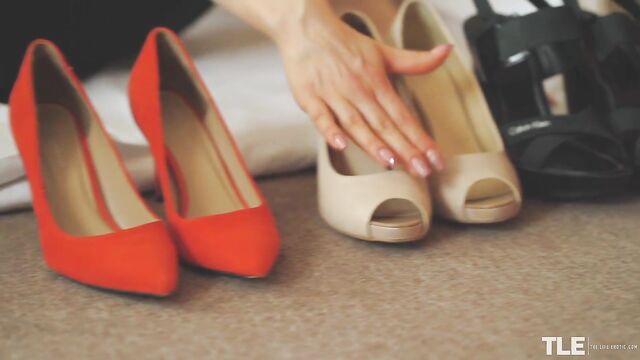 - Description: Sexy Dominica, a tall and slender tattooed blonde from Belarus, walks into her bedroom. She is wearing a sleeveless black leotard over large-mesh red fishnet pantyhose, and a pair of red suede spike-heeled pumps. She sits on the floor and removes one shoe then rubs the sole against her body, playing it toe-first against her crotch before stroking herself with the heel. She sets it aside, removes her other shoe and gives it the same treatment. She has three more pairs of heels lined up to play with and runs her French-tip manicure over them. Turned on, she begins to finger her pussy through the crotch of her leotard, then peels it off and tosses it aside. She rips a hole in her pantyhose, directly over her juicing, shaved pussy and slips a finger inside. Her other hand cups and caresses her small breasts, and she tastes herself off of her fingertips. She continues to masturbate, sighing and moaning as her pleasure builds and, with two fingers inside, she slows down for a while, not wanting to cum too quickly. She throws her head back, eyes closed in bliss as she sprawls on the floor, then she gazes down at her pussy as she plays with it. Next, she lies on her side and reaches back, grabbing a cream-colored peep-toe pump as she continues to pleasure herself. She bites her lip and rolls onto her belly, ass cheeks quivering as she frigs herself hard from behind. Her cries get louder and at last she cums, licking and nuzzling her shoes as she relishes the afterglow...