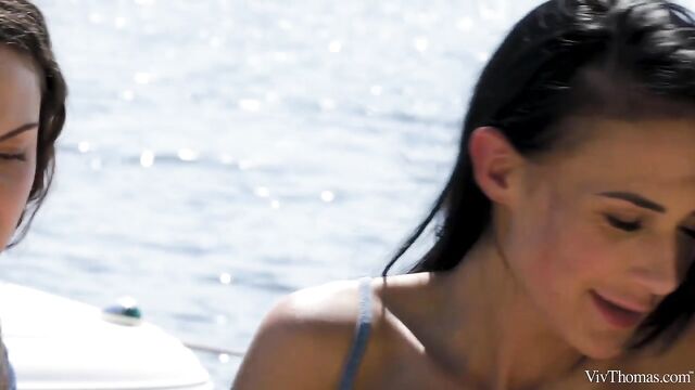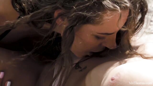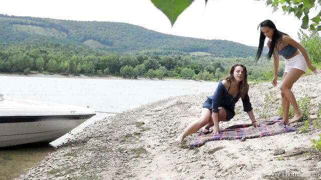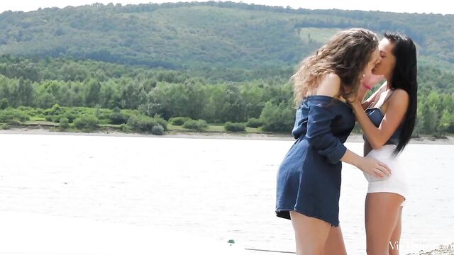 Busty babes Nicole Love and Sofia Curly meet on the river and are instantly attracted to each other, as episode one of Sandra Shine’s erotic lesbian series "The Pick Up" begins. Wavy haired beauty Sofia entices Nicole to join her onboard her boat, and they travel to a secluded spot upriver. The moment they step ashore they begin to grope and kiss each other voraciously. Pushing her onto a blanket on the sand, Sofia bares Nicole’s perfect breasts and flicks her tongue over her stiff nipples. She takes off Nicole’s shorts, trailing her tongue down to her tight panties and lapping at her pussy through them. Tugging aside the panties, Sofia licks Nicole’s shaved slit avidly, before rolling her onto her front and burying her face deep between her ass cheeks. As Sofia intensifies her oral pleasuring, jolt after jolt of sexual electricity shoots through Nicole’s body. She whimpers with delight as Sofia relentlessly tongue drills her; as her climax kicks in, her body trembles and she slumps onto the sand, sated. Sofia strips and straddles Nicole’s pretty face, fondling her fantastic big breasts as she rocks steadily, her face a picture of arousal. Nicole holds Sofia’s juice-slick pussy lips open and licks her skilfully. Sofia grinds down harder, curvy body undulating and boobs jiggling as she orgasms. The gorgeous girls kiss, breasts pressed together, both utterly enamored.