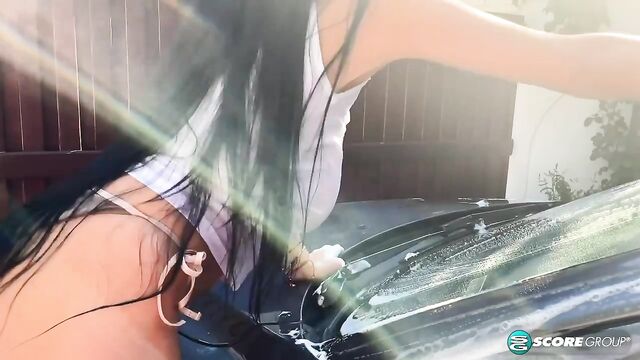 Helen Star made our car wash dreams come true with this soapy scene. This is old-school, sexy babe auto-buffing with a hose, sponge and bucket. No automated roller machines to drive into. We've got Helen wearing a white tank that sticks to her lovely body and bikini bottoms. This is high-quality car maintenance. And the black-haired Romanian beauty does it in sky-high heels. Amazing. What a chassis. What a fantastic, load-bearing framework. Look at those bumpers. And the car is good-looking too. "I like to play in the shower," said the always cheery and happy Helen. She seems to be attracted to water. "I like to sing in the shower, too. I dream of having sex in a pool. "I like a lot of attention and I think it's fun to see men losing their minds over me and my cleavage. I like to dress very sexy, but it doesn't matter what I put on, my boobs stick out. Guys are always asking me questions about my body."