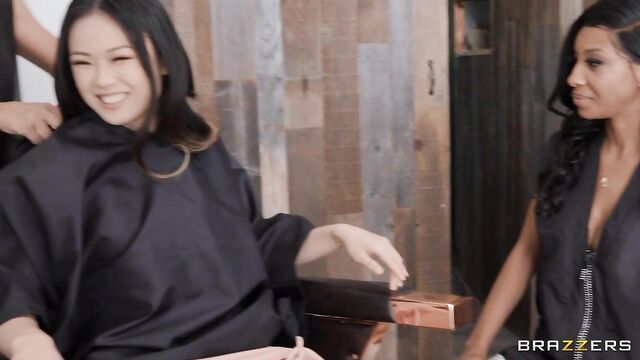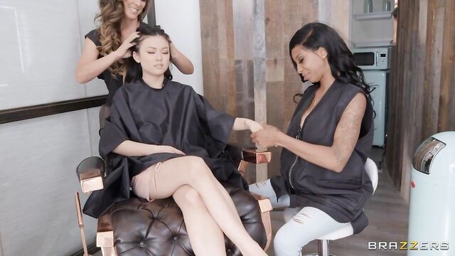 Lulu Chu is treated to the total package at Cherie Deville’s salon. As Lulu gets comfy in their chair, Cherie helps them relax with a massage, soon joined by her coworker September Reign, with both of them sensually rubbing down Lulu with their skilled hands. Hot and horny for their new client, they strip naked and lick Lulu’s pussy before Lulu takes turns getting a taste of theirs during a hot lesbian threesome. When Lulu’s boyfriend Lucas Frost catches the babes in action he’s shocked, but Cherie tells him to come and relax too, pulling him into what turns into a wild and sloppy foursome instead!