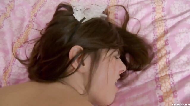 There comes a point in a teen's life when she starts to discover her inner sexiness. It's almost a rite of passage, and here is Jackie to demonstrate with her provocative french maid's outfit! It's a pleasant surprise for Alex to walk in on her dusting his room in such irresistible fuck attire. His hands are already up her skirt, clutching and groping Jackie's lovely boobs and booty. He pulls down her top. Naughty tramp didn't even bother with a bra. Still wearing her cute tiara, Jackie brings Alex's fat prick to her mouth and slurps as much as she can. See this fantasy piece of tender teen fuckhole get fucked at last.