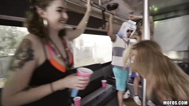 Arya is stranded on the way to spring break, but there's help on the way! When the hot blonde spinner is offered a ride on a party bus full of wild students, she says thank you by giving a strip show to the crew, then sucking and fucking the host!